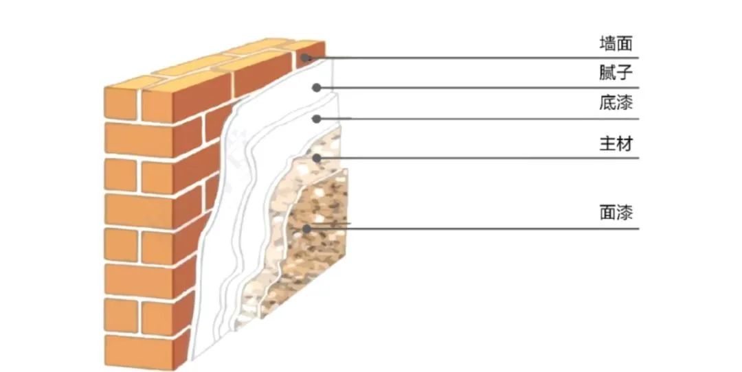①膩?zhàn)樱ɑ嬲移剑沽眩诘灼幔B透性,抗堿性,封閉性)→③主材(裝飾性)→④面漆(自潔功能,耐水,耐臟)。